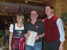 Die Skiausfahrt 2010 stand ganz im Zeichen unseres Jubilars Hans-Otto, der heuer sein 20-Jähriges Hirzer Jubiläum feiern durfte. Dem Ältestrat des HFP wurde in Südtirol an allen Ecken und Enden der rote Teppich ausgerollt. Das Hirzer Hotellier-Ehepaar Evelyn und Luis Mair scheute keine Kosten und Mühen und überreichte dem unermüdlichen Hirzer-Gänger anlässlich seines "Zwanzigers" standesgemäß ein überdimensionales Willi-Glas (Bild links):